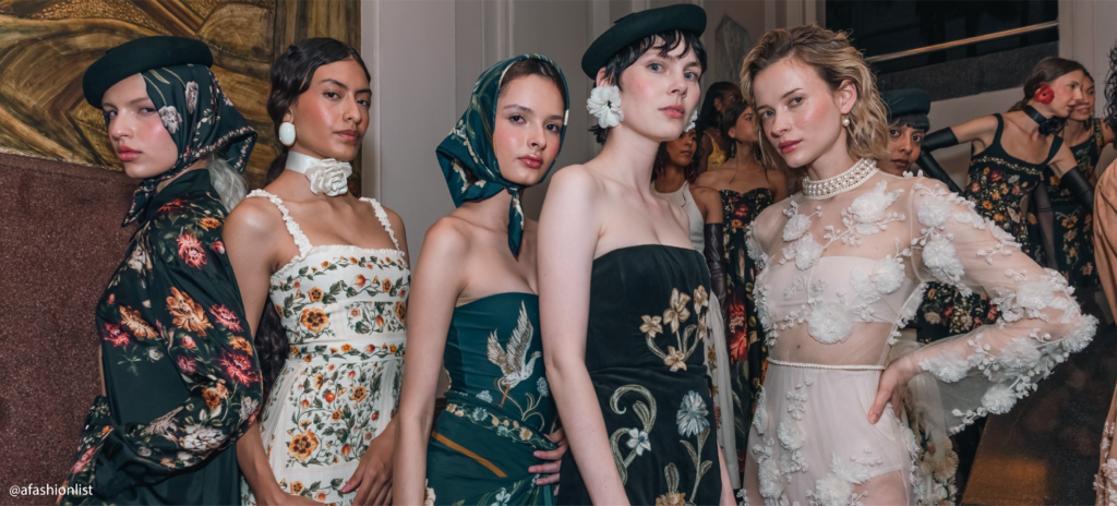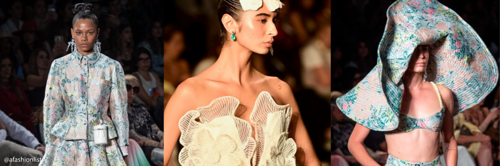 La pasarela se dividió en 2 partes, la primera “Hijas del Agua” por Agua Bendita, con su propuesta de icónicos bikinis y detalles minuciosos en procesos manuales, también, llegando a la línea Ready-to-Wear. El segundo acto, presentada por su marca hermana Agua by Agua Bendita con “Ocaso”, 27 looks guiados en una temática resortwear, con prendas en colores que se conectaban uno tras otro, recamados, terciopelos y siluetas que bailan con la repetición de las flores. Fue un jardín andante, con modelos congelados en el tiempo, la ilusión de una cosecha floral exitosa añadidas a los diseños.